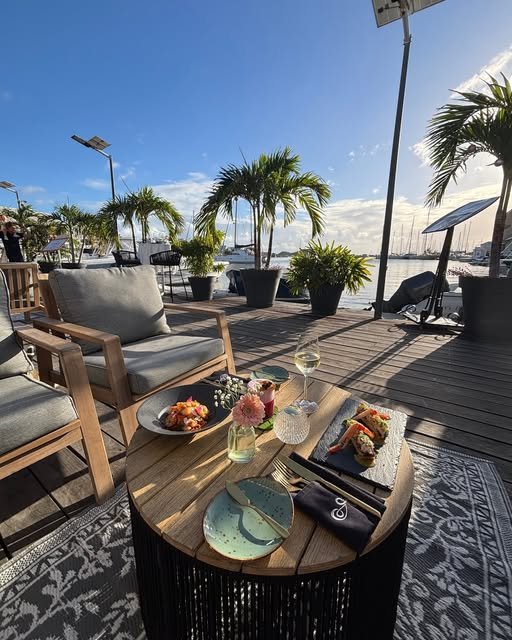 Restaurant and lounge serving an elegant dining and cocktail experience in a vibrant and comfortable atmosphere, waterside on the Marina Royal in the heart of Marigot.