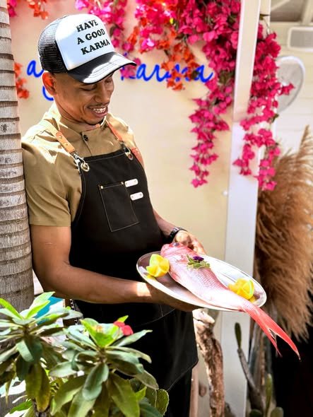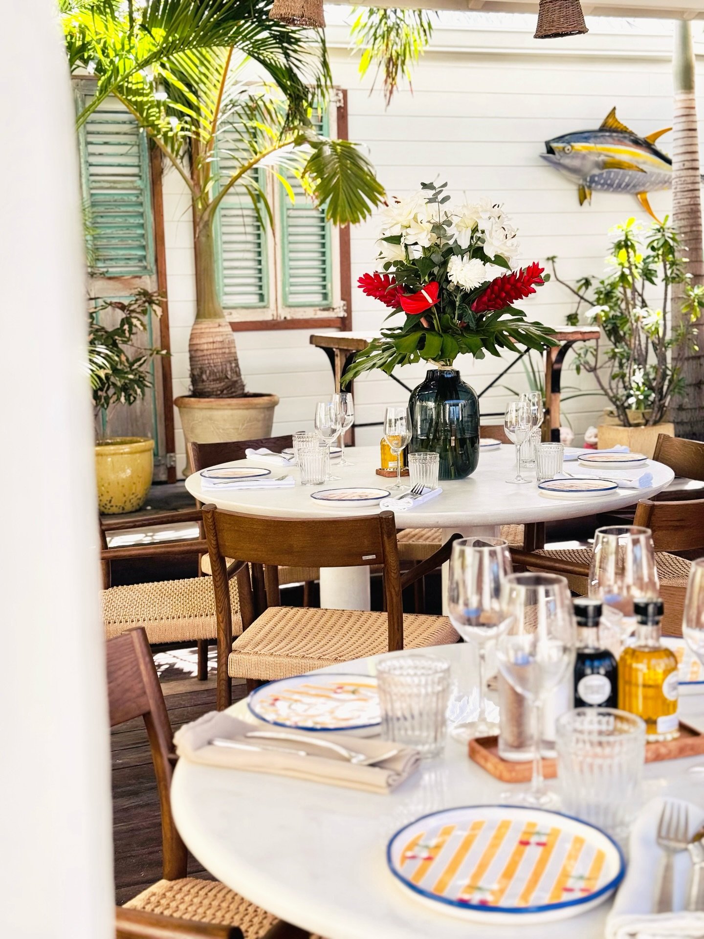 We lean on the pass and discuss the day’s suggestions, traditional Caribbean preparations with seared octopus flambéed with loin, pistachio-crusted mahi-mahi and sautéed vegetables.